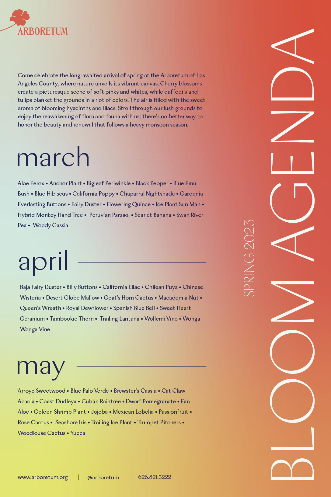 The Arboretum of Los Angeles County (formerly known as the Los Angeles County Arboretum and Botanical Gardens) is a 127-acre botanical garden and historical site located in the city of Arcadia. It currently lives in the shadows of competitors like the Huntington and Descanso Gardens, and is largely frequented by the elderly and young children. In the process of conducting a rebrand of this non-profit organization, the goal was to target young adult audiences and implement event programming initiatives that fuse environmental education and entertainment.